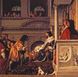 Op een schilderij van Caesar van Everdingen (1616-1678) geeft Willem II, graaf van Holland, zittend op de troon in 1255 bepaalde privileges aan Rijnland. (Gemenelandshuis, Leiden)