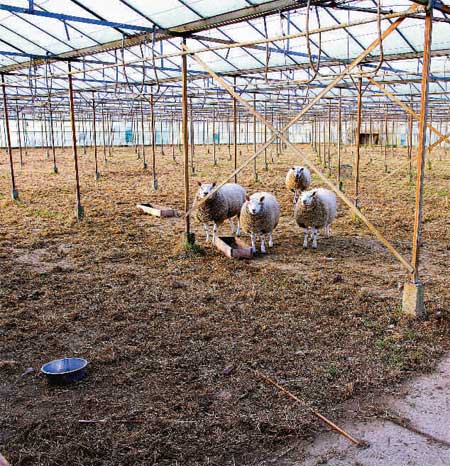 In de oude kas aan de Plaetmanstraat in Heerhugowaard, waar voorheen onder andere sla, komkommer, bloemkool en andijvie werd geteeld, lopen nu enkele schapen. (Foto TM)