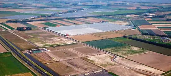 Luchtfoto van Agriport A7 in de Wieringermeer, een nieuw Noord-Hollands bedrijventerrein speciaal geschikt voor grootschalige glastuinbouw. (Pc)